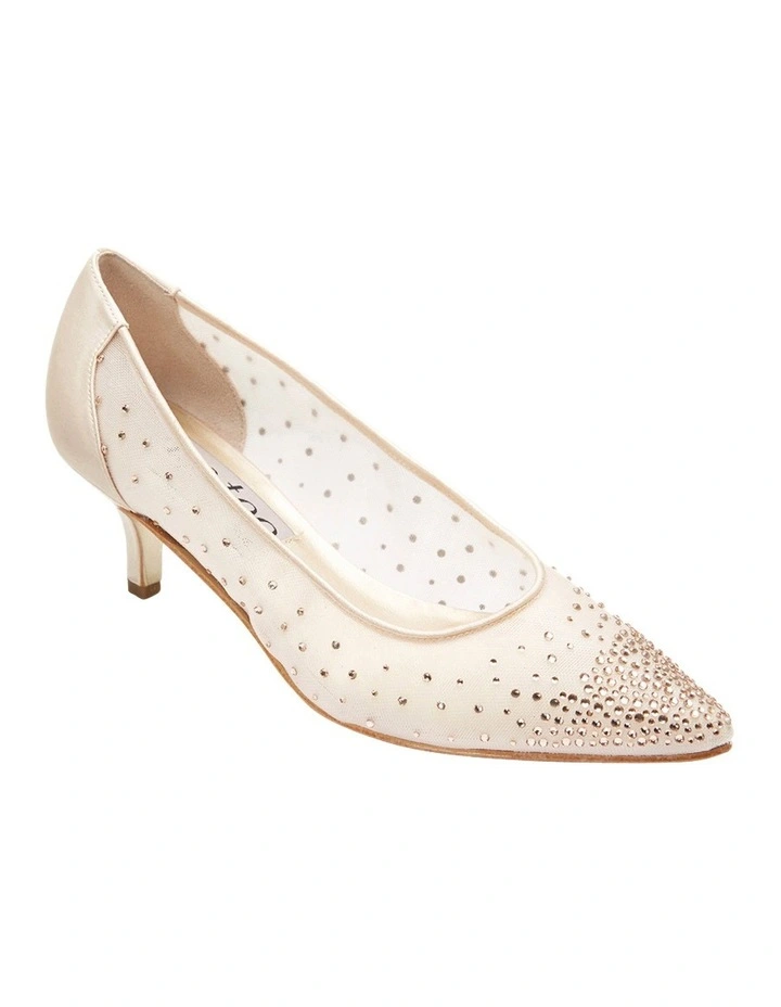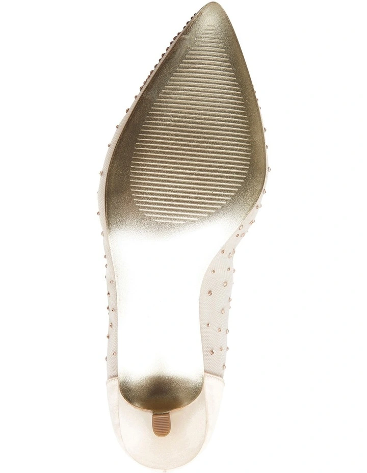 Our favourite elegant point toe pump has been re-designed at new heights. Delicately dressed with a pink satin trim and matching jewel embellishments, this style is wins best dressed at every occasion.