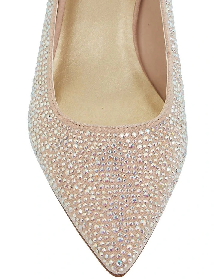 Dazzle on the dance floor with Teagan. This sleek kitten heel pump is adorned with embellishments, an adjustable sling back strap and on-trend pointed toe heel.