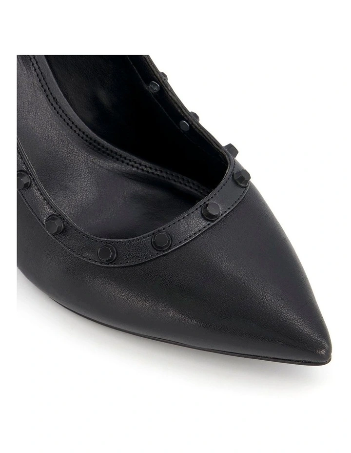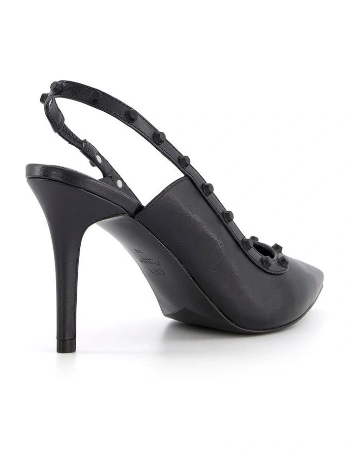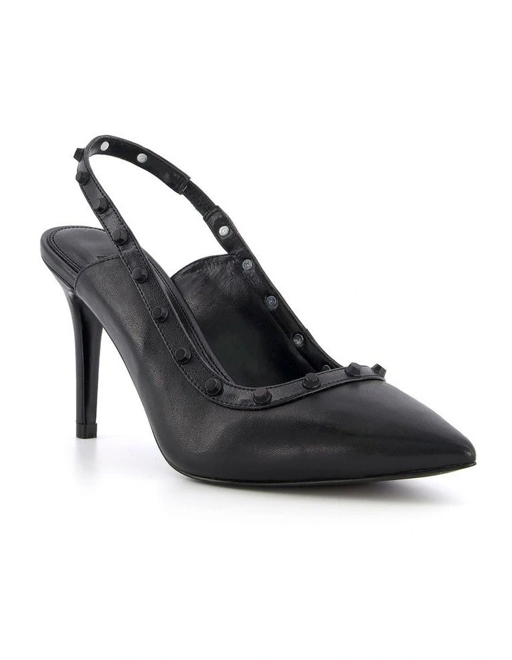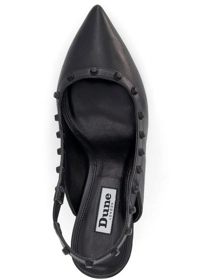 Studded slingbacks to anchor loud outfits. Defined with a pointed toeΒ they’re adorned with striking studded accents. Resting on a mid stilleto heel.
