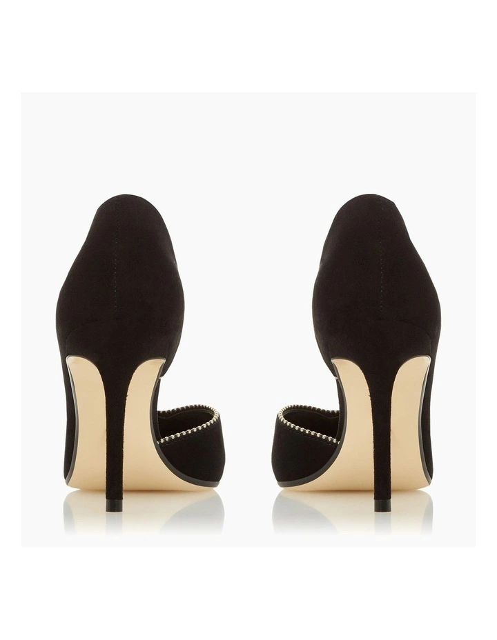 Compliment formal looks with the Dream court shoe from Dune. Cut from suede it’s shaped with a pointed toe. While gold metal embellishments decorate it.