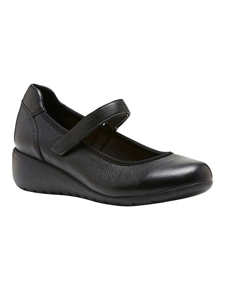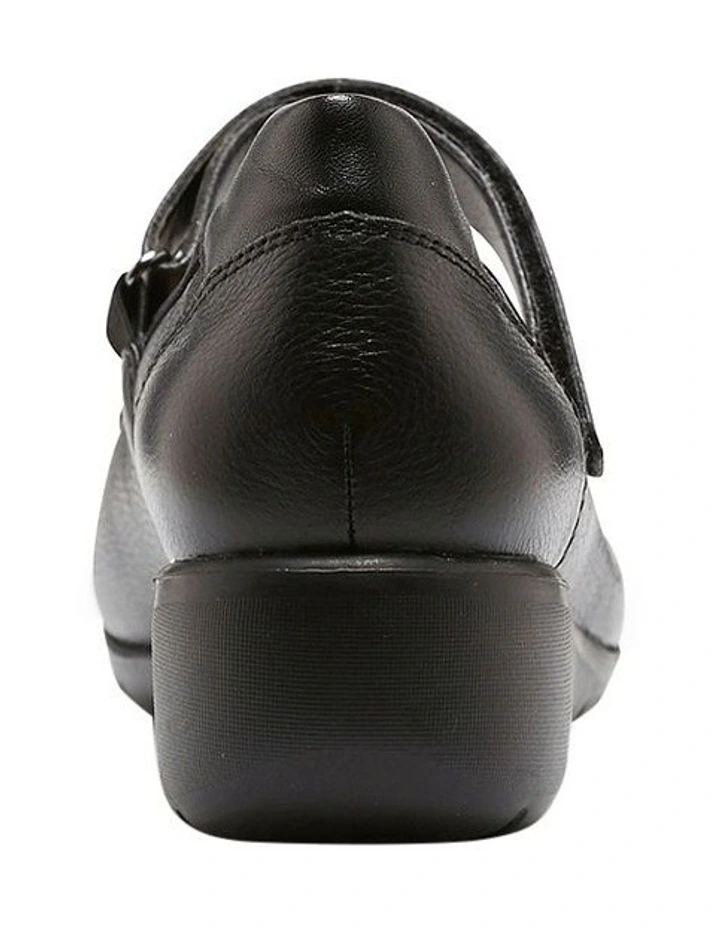Perfect for workers on their feet all day who require leather uppers for easy cleaning. Featuring a super light-weight wedge, mary-jane self-fastening strap and soft padded lining for extra comfort. Also features an orthotic friendly removable footbed which provides dual fit.