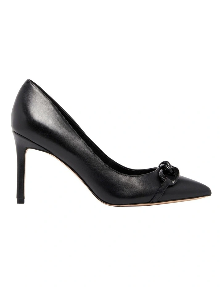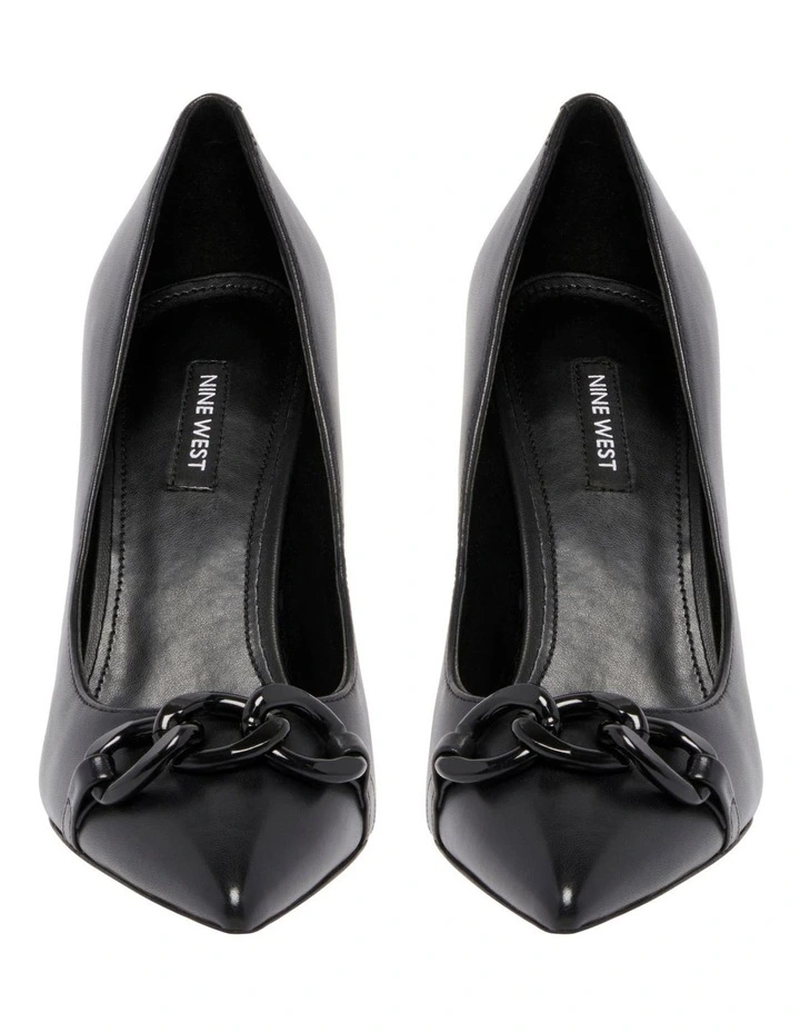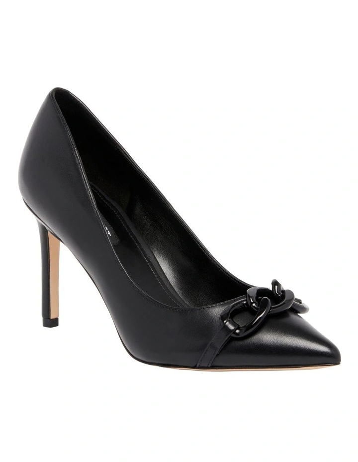 The Ezzie Pump is a classic staple with a fashionable update. Featuring a timeless stiletto heel, closed back, pointed toe and comfortable footbed, Ezzie will seamlessly transition from work to weekend to after-dark events. The chunky chain detailing on the top of the toe, creates a statement to this streamlined silhouette.