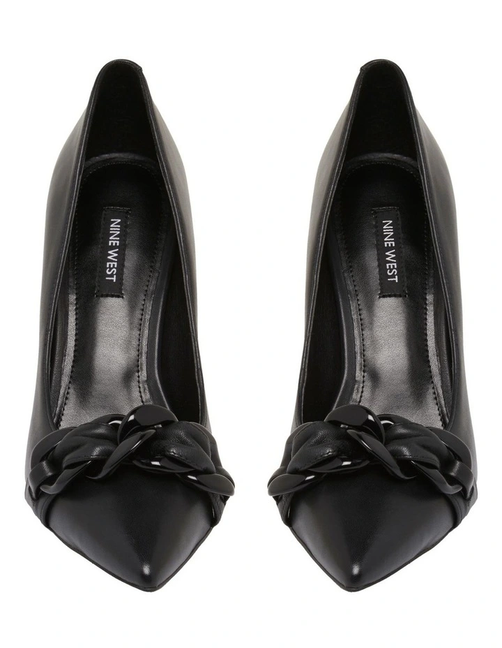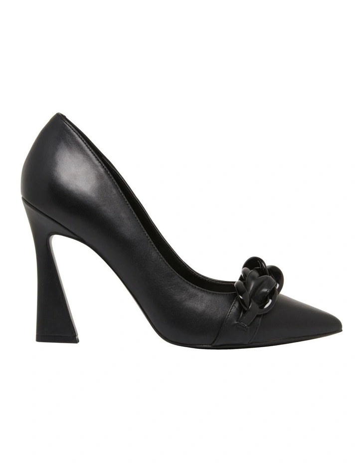 Inspired by shape and volume, the Tazz Pump features a burst of statement details. Interpreting the sculptural stiletto trend, Tazz is constructed with a flared heel, creating a playful spin on the classic pump silhouette. A chunky chain detail, married with a woven texture rests on the pointed toe to enhance the trendy appearance of Tazz and encourage endless styling possibilities.