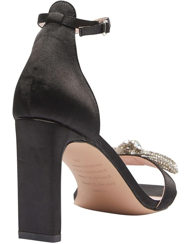 Evoke a glamorous aesthetic with HONEY. They’re crafted to a contemporary open squared toe profile, delicately adorned with a glistening crystal bow across the front strap, set on a straight squared heel and then secured with a slender adjustable ankle strap. Slipping seamlessly into your special occasion looks, make this your statement heel to be seen.