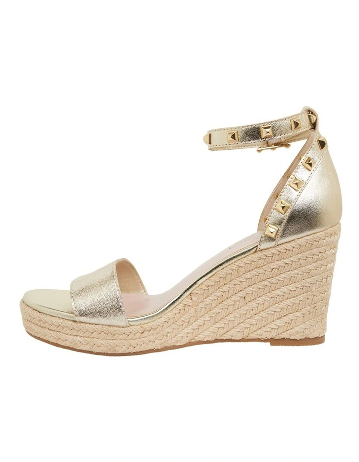 SHADOW is an edgy reimagining on a classic summer staple. The open toe style features a front leather strap and complimenting heel panel, punctuated with gold-tone studs and fastened with an adjustable strap, then rest on a braided high wedge heel. Style them with a printed mini dress and rustic bag to complete a vacation ensemble.