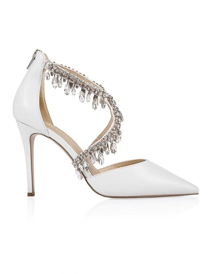 Meet BELLA, our stand-out pointed stiletto heel for your next special occasion. Bella is the perfect shoe to complete any dressy look, with jewelled hardware adorning the upper straps, a zip up enclosed heel, and a sleek point toe.