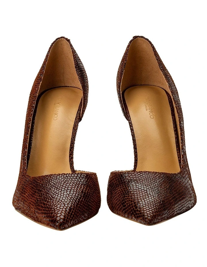 For a court shoe that exudes femininity look no further than the Alyx chocolate brown stiletto heel. Showcasing a perfectly pointed toe-shape, these brown pump shoes are designed with an ultra high stiletto heel, a curved vamp and is finished with a deep brown hue. Pair with fitted pants and a blazer for a corporate work shoe option.