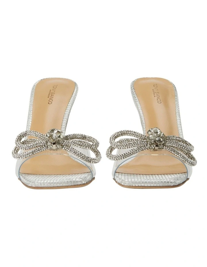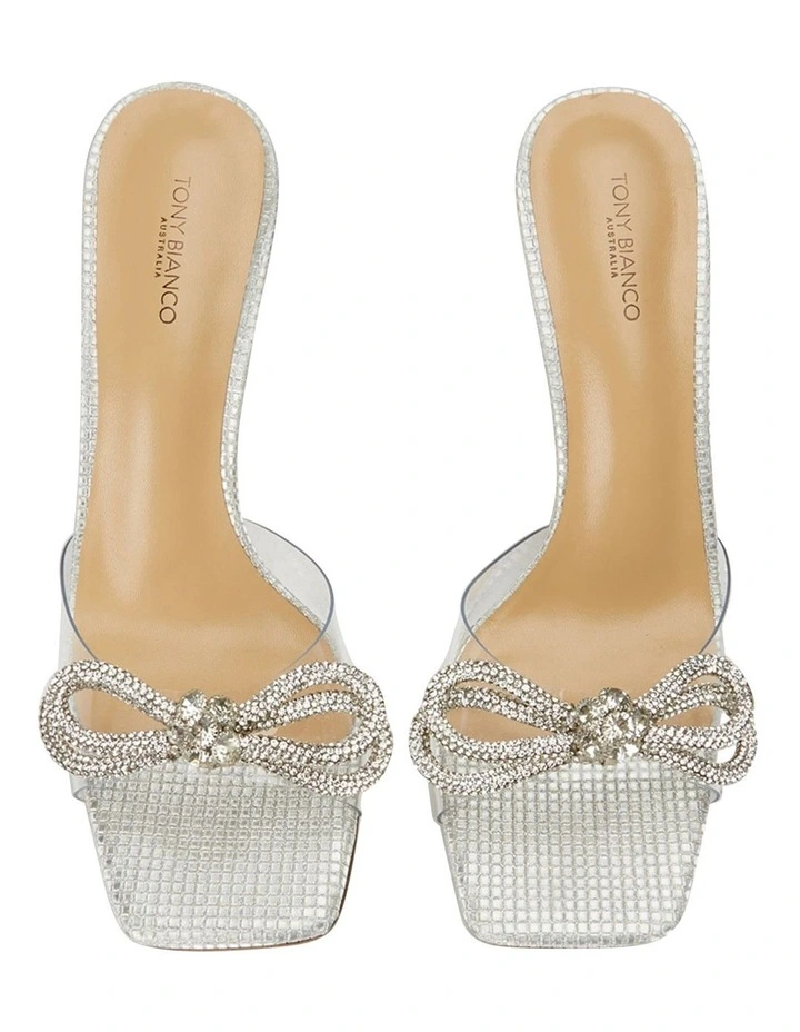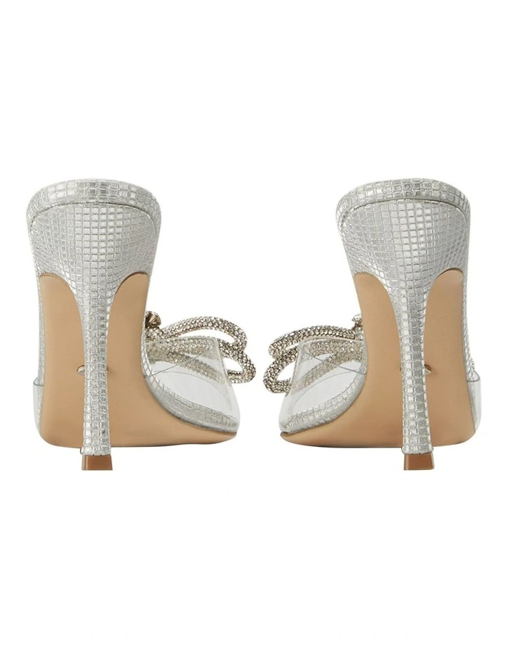 What’s better than a bow? Introducing Franki your next bling mule moment. Featuring a chic silver satin-like finish, timeless lower stiletto heel and open-toe silhouette. This forever piece is topped with a glamorous bling bow and vinylite upper, to keep things lux this season.