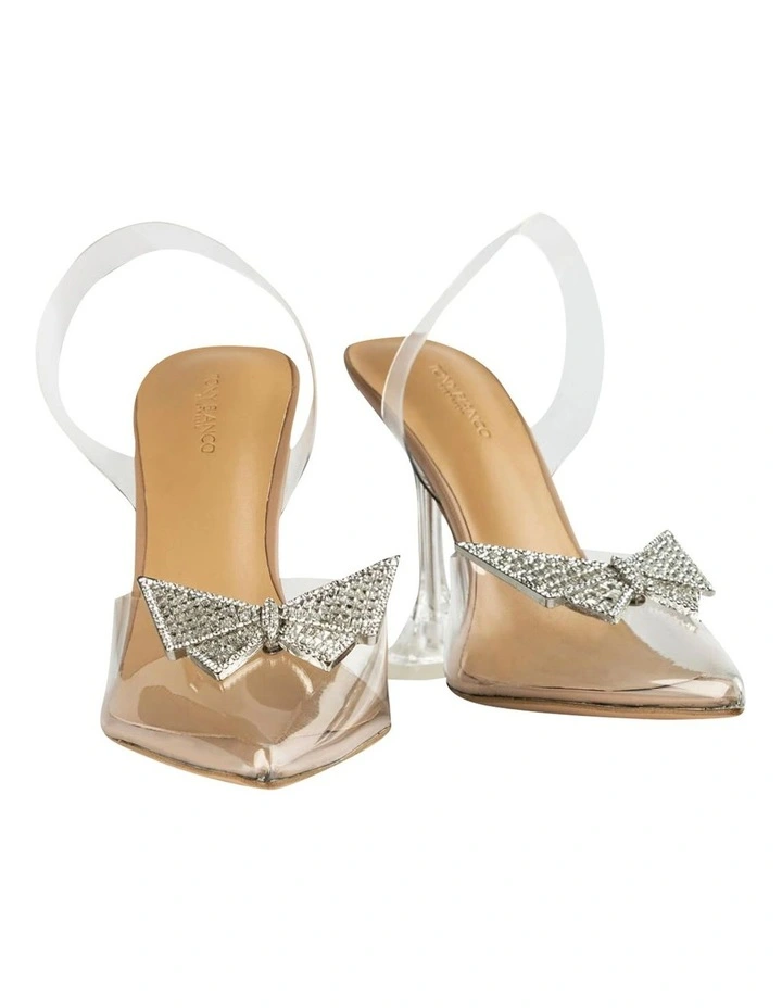 See-through style sorted with our Laos pumps. This clear vinylite style showcases a pointed toe design, a statement silver feature to the top and is finished with a see-through ankle strap and a perspex hour-glass shaped heel.